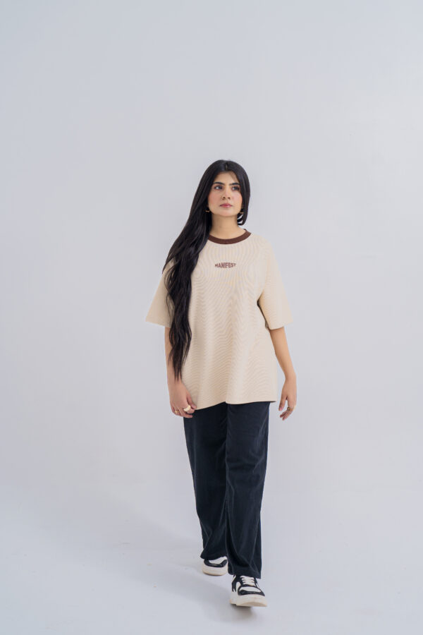 Design details: Half Sleeves Drop Shoulder Tee Shirt with Print on Front and Brown Rib on Neckline.